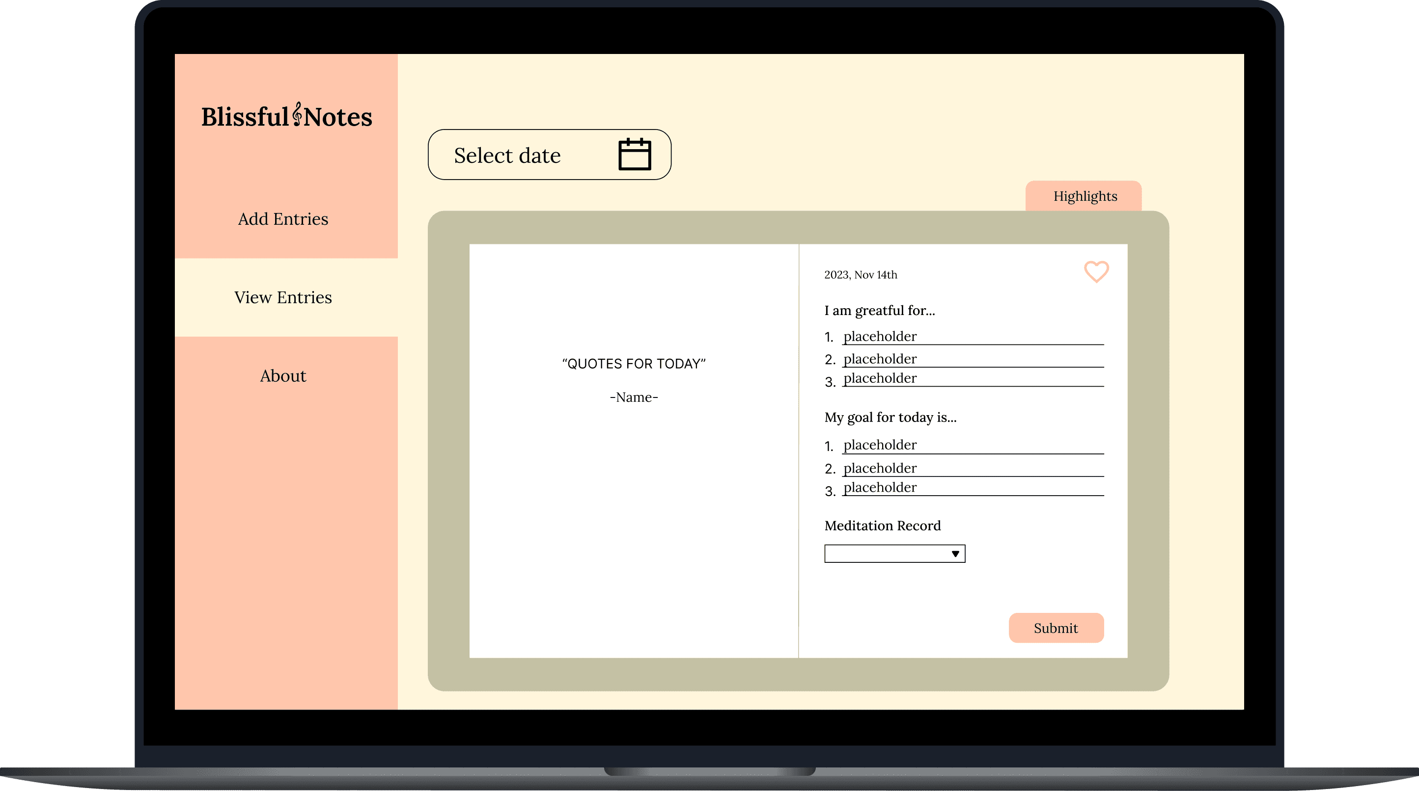 The next step is to add a "Highlights" page where users can save and revisit their favorite entries. Currently, past entries are accessible only through the date picker, one entry at a time. To improve usability, I plan to implement a list view showing 10–20 entries at once, along with a keyword search feature to help users quickly find specific journal entries.