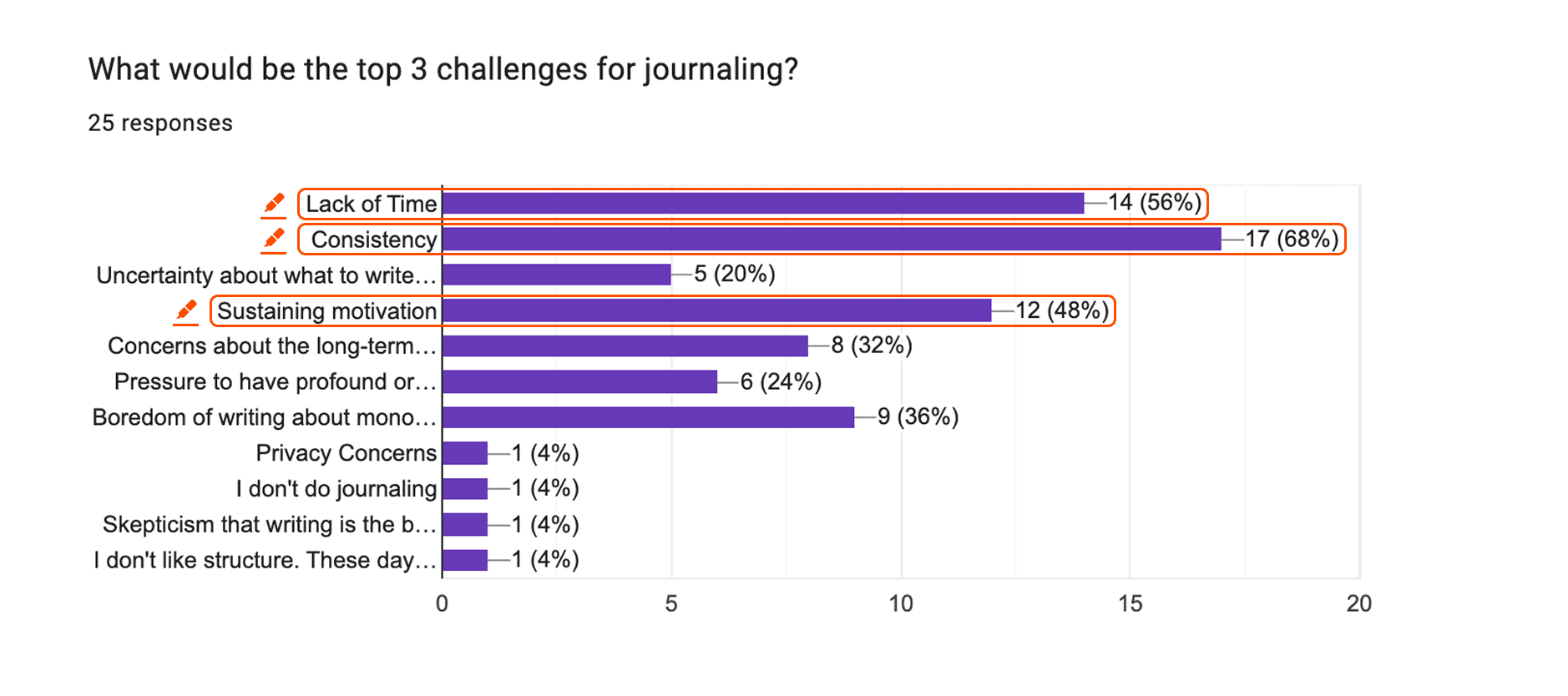 Survey results for top 3 challenges for journaling.
