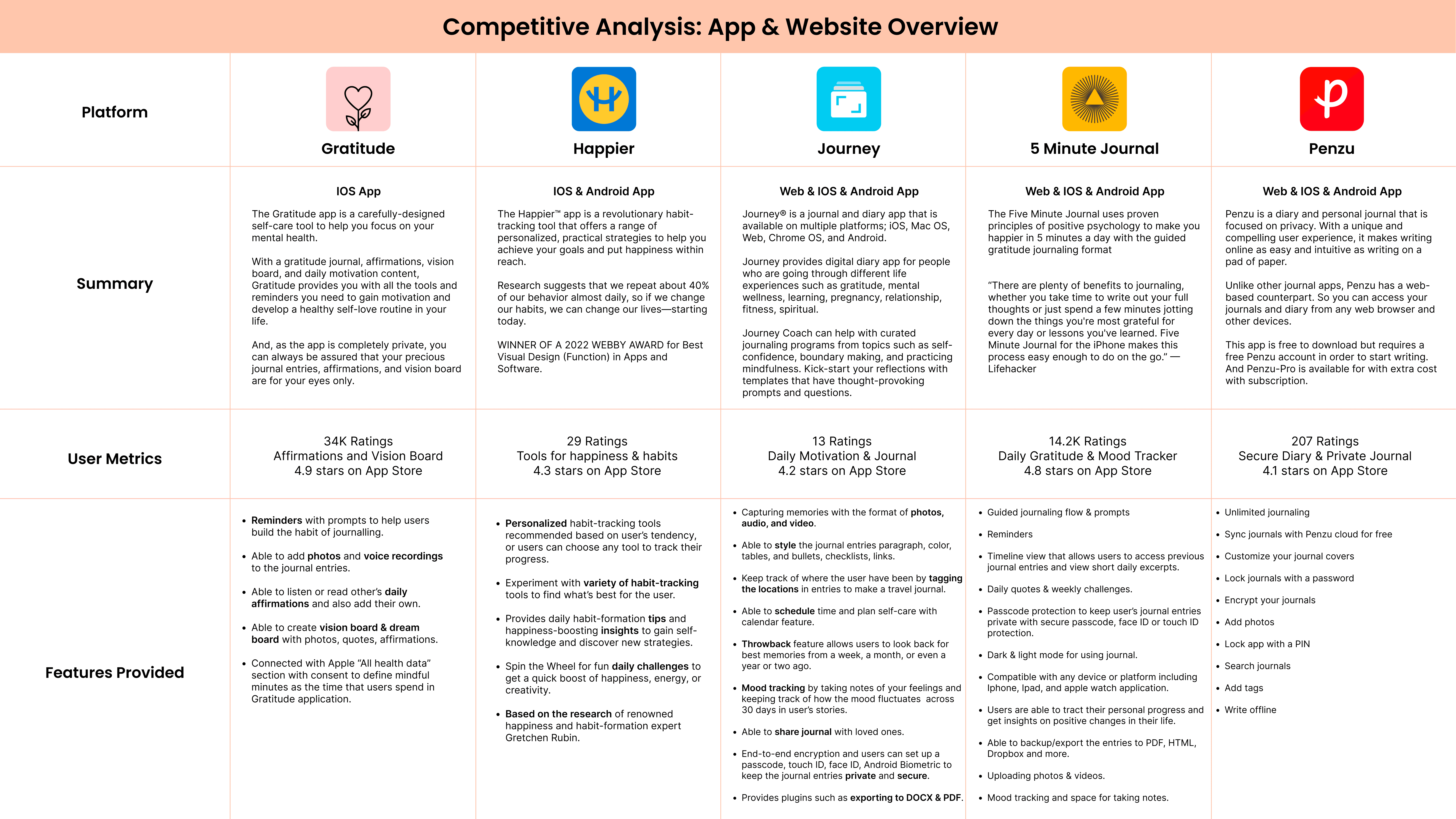 Using competitive analysis method, I compared 5 existing journaling applications and websites to find out the user metrics, existing features from similar products.