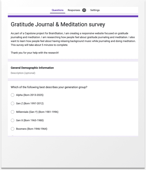 For quantitative data, I created the survey using Google forms. The survey was designed to take about 5 minutes to complete with 15 questions. In result, I got 25 responses for the survey.